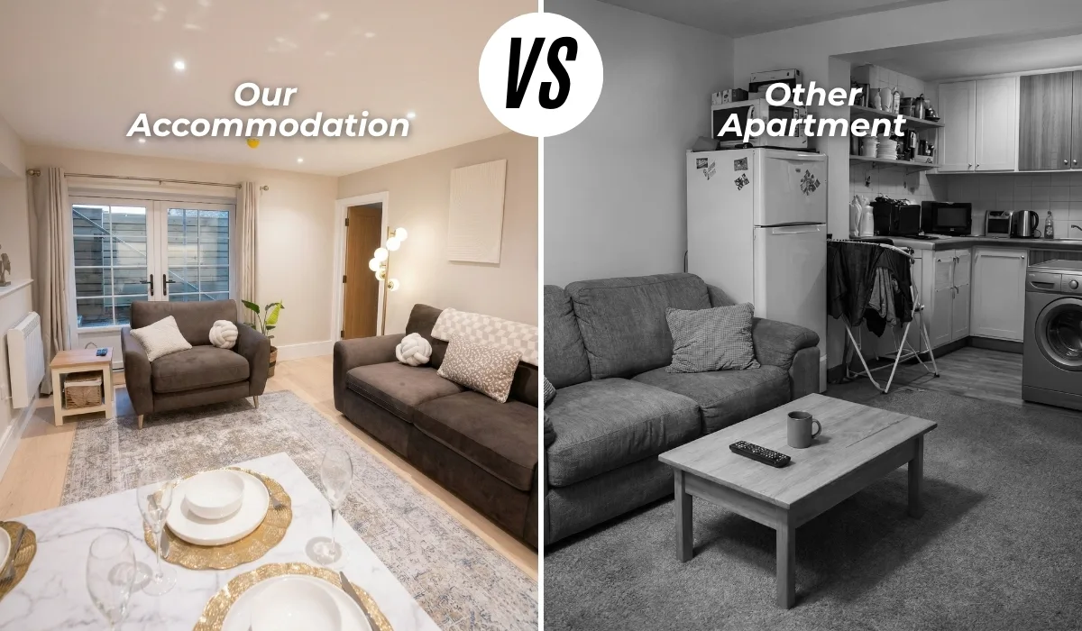 Most guests who switch from hotels to luxury serviced accommodation never go back. The difference is practical, not just aesthetic. A serviced apartment gives you a living room, a private kitchen, a washing machine, and the space to live not just sleep. For business travellers, couples, and groups alike, that gap matters.